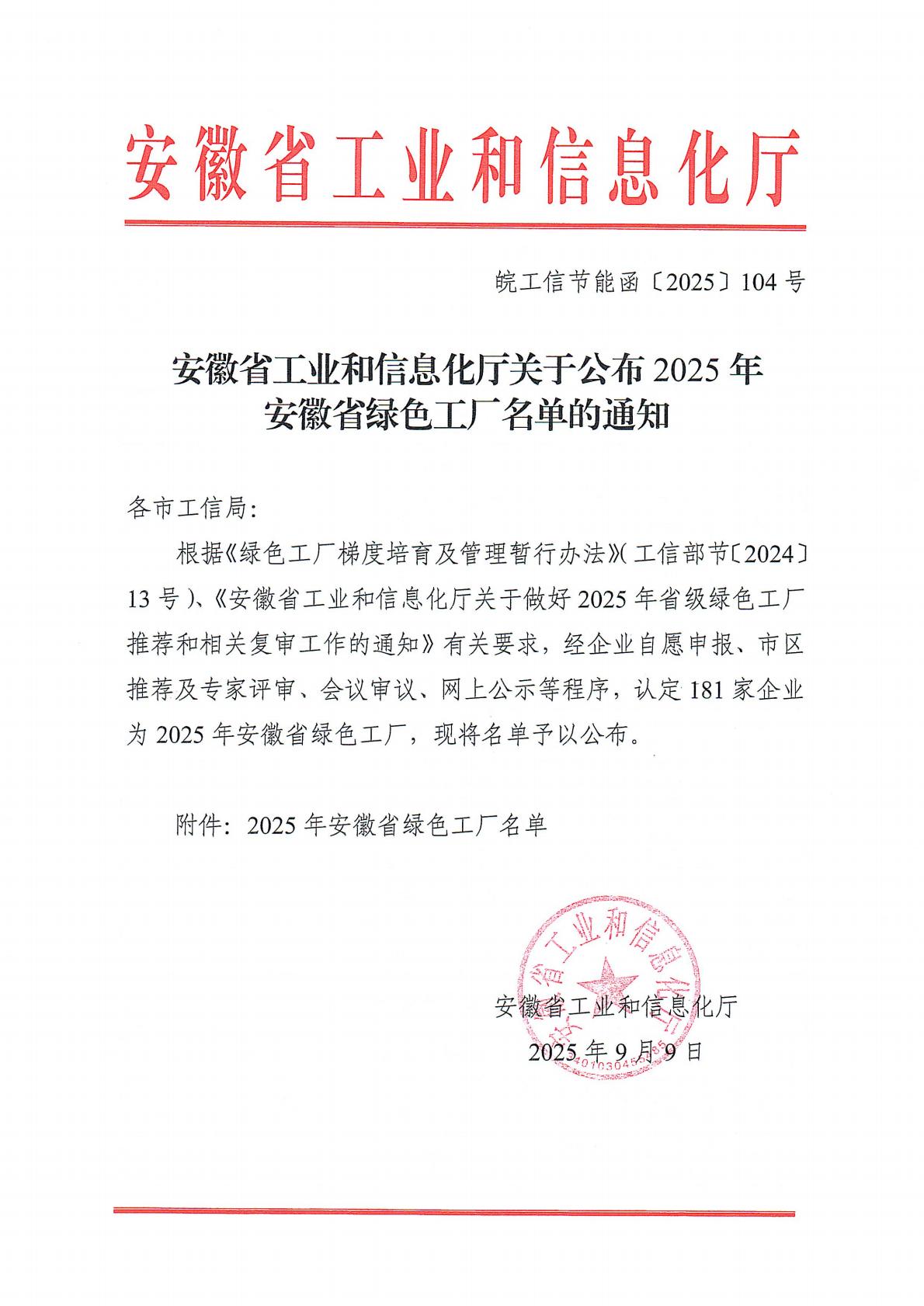 近日,安徽省工业和信息化厅正式公布2025年安徽省绿色工厂名单,安徽galaxy银河电气科技股份有限公司凭借在绿色制造领域的突出表现成功入选。