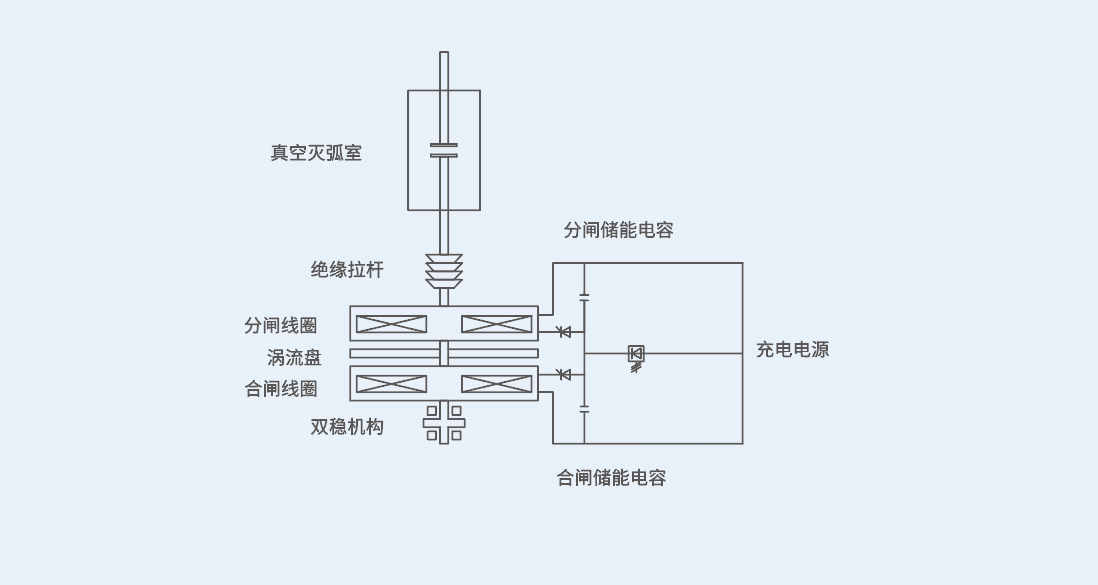 基于快速涡流斥力技术的快速真空开关:如图所示,主要由真空灭弧室、绝缘拉杆、分闸线圈、合闸线圈、涡流盘、分闸储能电容、合闸储能电容、分合闸放电控制开关和充电电源等主要部件组成,具体动作原理为: