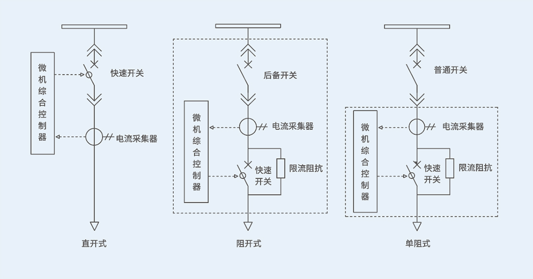 母线残压保持装置根据不同的功能要求和组成形式可分为三种类型,分别为直开式、阻开式和单阻式。图为三种型式的一次模型。